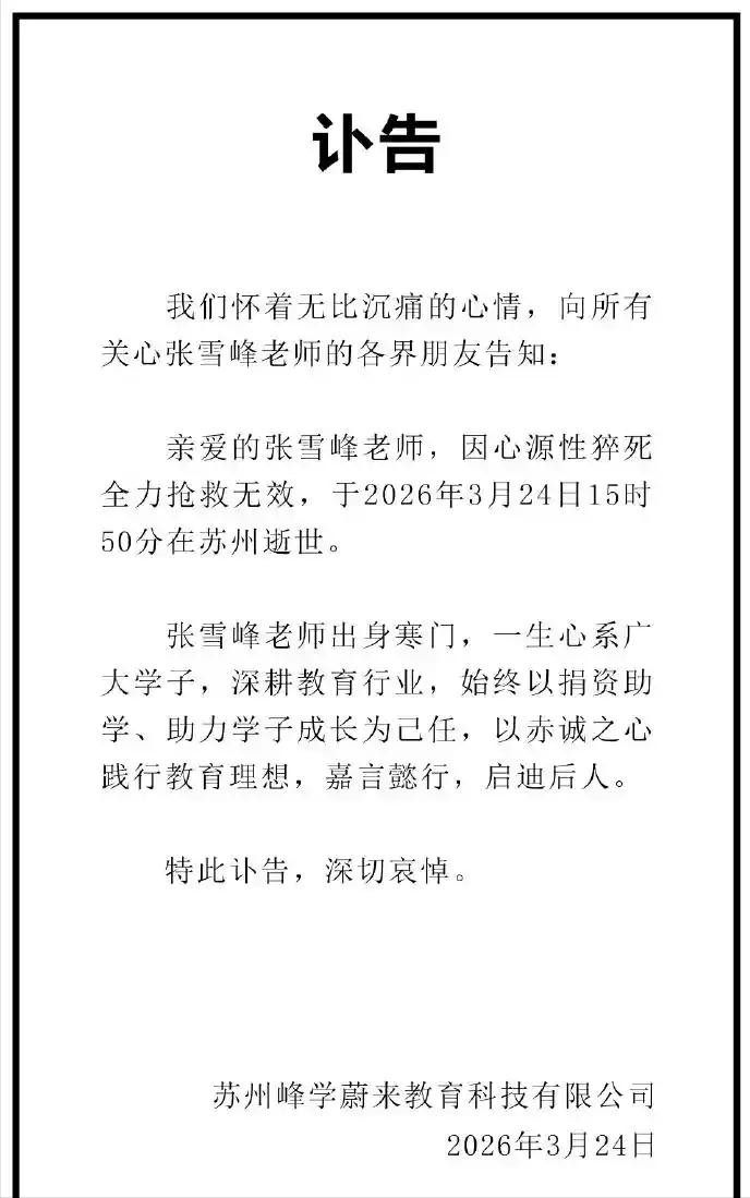 3月24日晚上,苏州峰学蔚来发了讣告,阐述张雪峰因心源性暴毙,抢救无效,在本日地午3点50分于苏州圆寂。