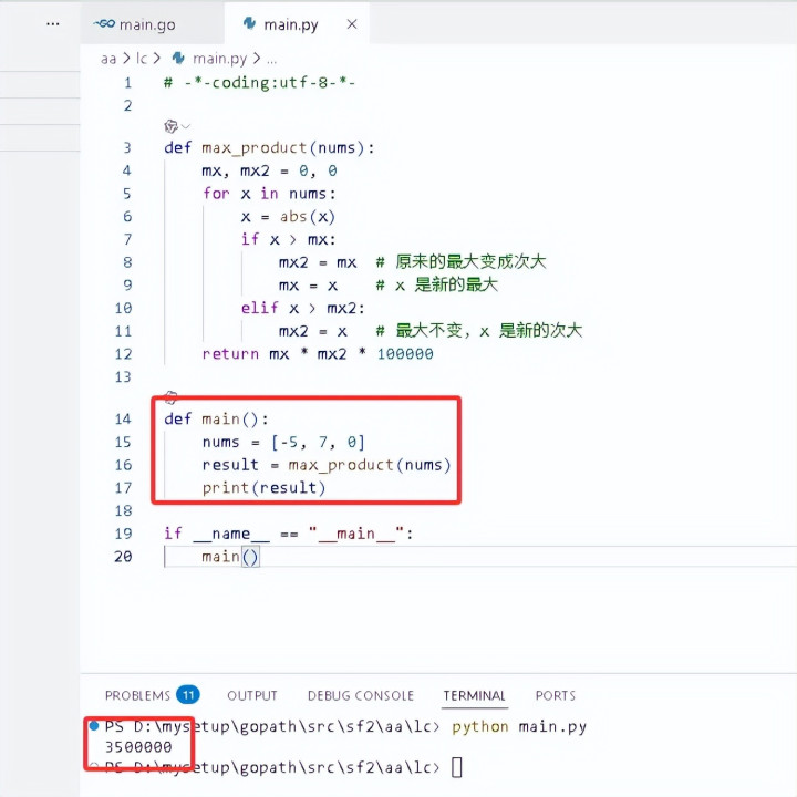 • 替换 0:替换成 -100000 后,三个数为 -5、7、-100000,乘积 = (-5)×7×(-100000)=3500000;