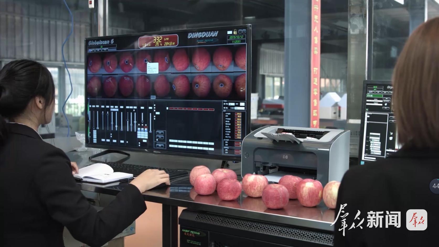 图为洛川县凤栖镇苹果产业园区,陕西尖端果业科技有限公司的智能分选线收尾室内,使命主说念主员正在操控分选系统。