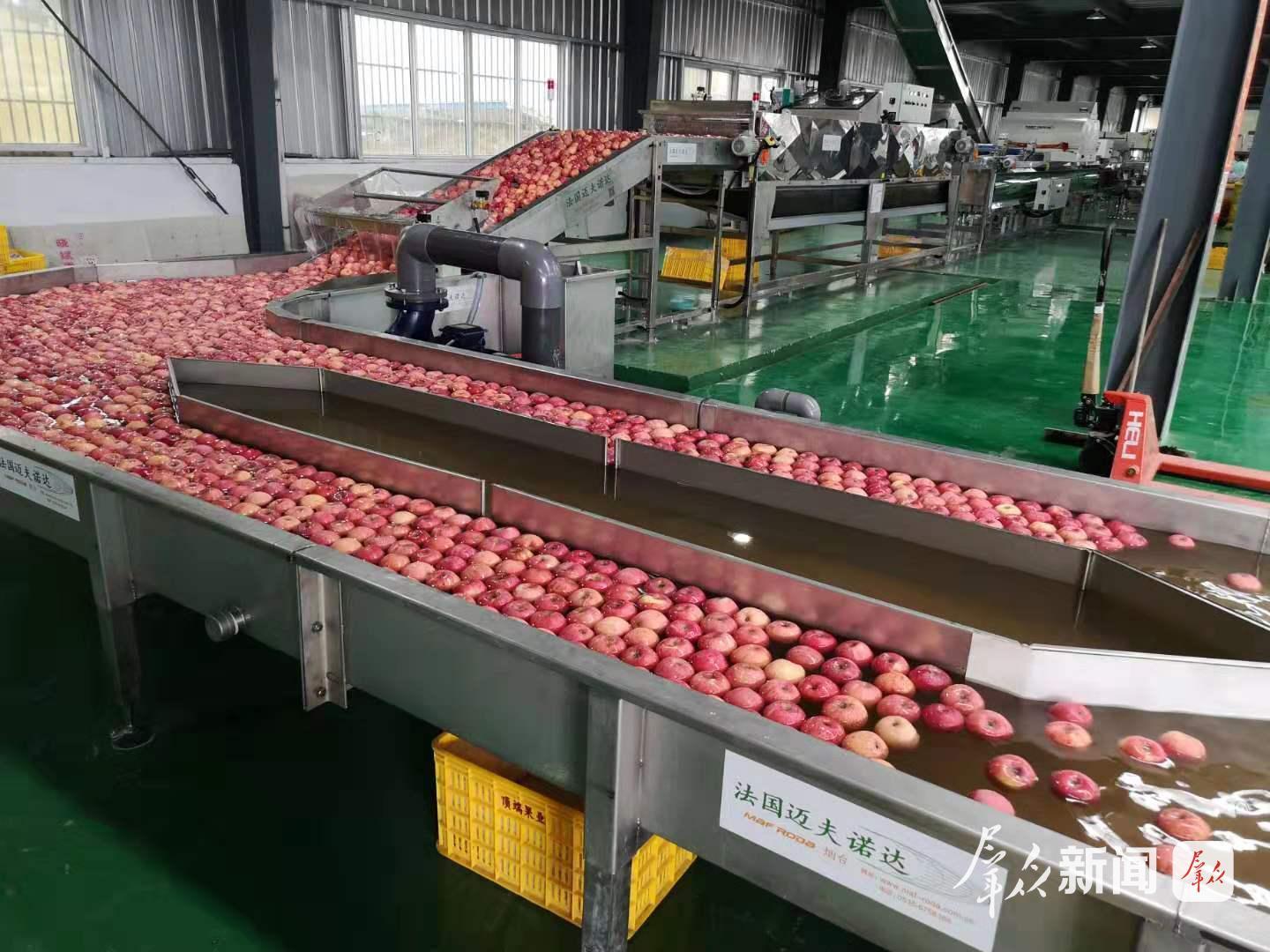 图为陕西尖端果业科技有限公司的智能分选车间内,智能分选线正在进行苹果漂洗。